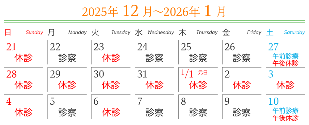 HOME お知らせ 年末年始休診のお知らせ 年末年始休診のお知らせ 2025年12月28日(日)から2026年1月4日(日)まで年末年始の休診とさせていただきます。1月5日(月)から通常診療いたします。ご不便をおかけいたしますが、よろしくお願いいたします。